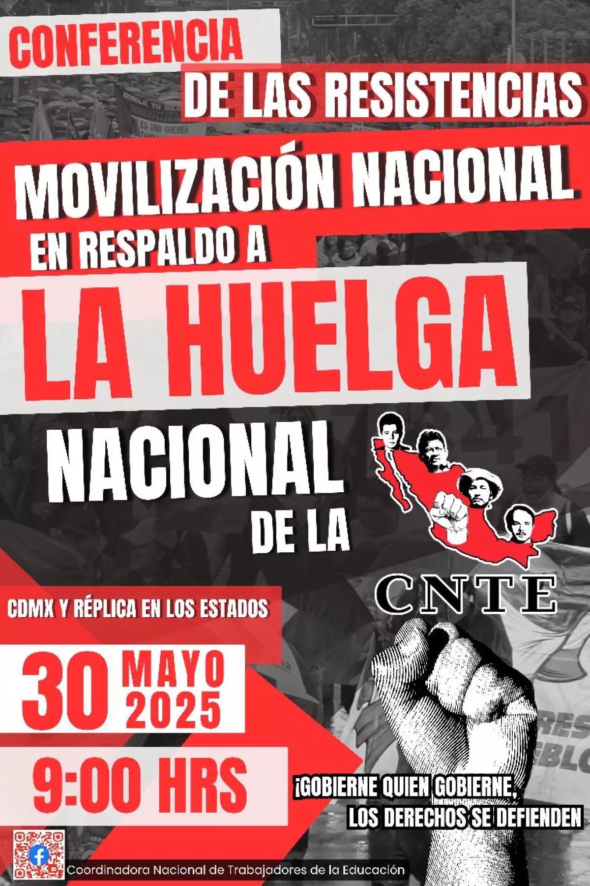 “La conferencia de las resistencias convoca a respaldar la huelga nacional de la CNTE este 30 de mayo. Nos movilizamos por pensiones dignas, salarios justos y la abrogación de la Ley del ISSSTE 2007. Desde cada comunidad, cada escuela y cada rincón del país”, exhortó a través de redes sociales.