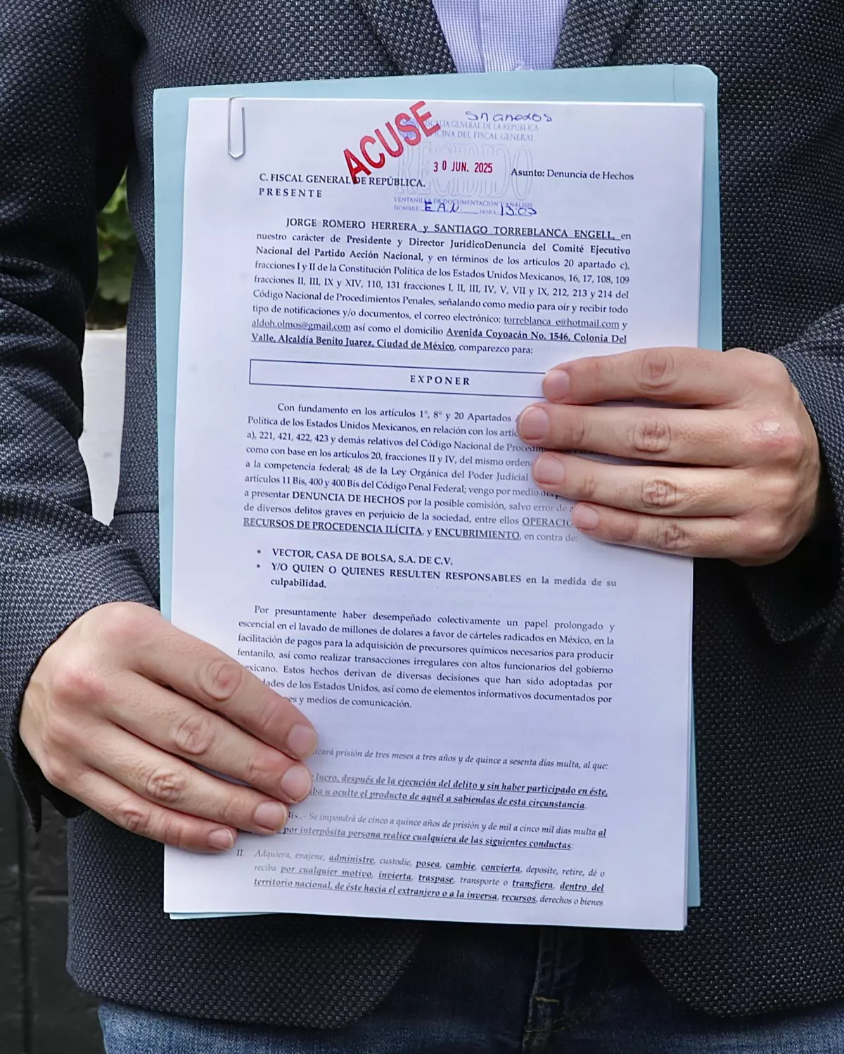 "De lo manifestado por la Red de Control de Delitos Financieros de Estados Unidos (FinCEN), a partir de la información que obra en sus archivos, se desprende que Vector Casa de Bolsa, S.A. de C.V presuntamente arrastra un historial sostenido de vínculos con organizaciones internacionales dedicadas al tráfico de drogas y ha facilitado operaciones en su beneficio", agrega la denuncia.