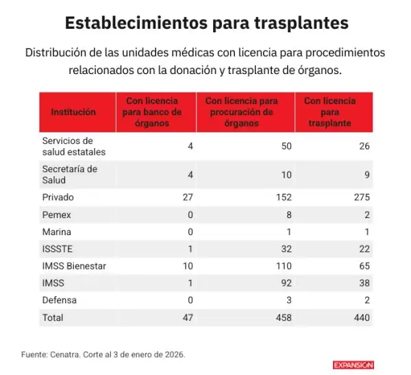 Otro problema para los trasplantes es que la mitad de los programas y unidades médicas con licencia para donación y trasplantes de tejidos no operan. El Cenatra registra 613 establecimientos aprobados (pueden tener más de una licencia) y se ha propuesto reactivarlos todos. Pese a ello, el 70% de los trasplantes se hace en hospitales públicos.