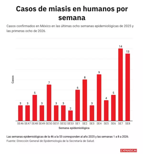 En total, en 12 estados se han notificado casos de miasis en humanos. Chiapas, sin embargo, continúa a la cabeza de esta enfermedad con 119 casos acumulados desde 2025. Le siguen Yucatán, con 23; Oaxaca, con 16; Quintana Roo, con 12, y Veracruz, con 8.