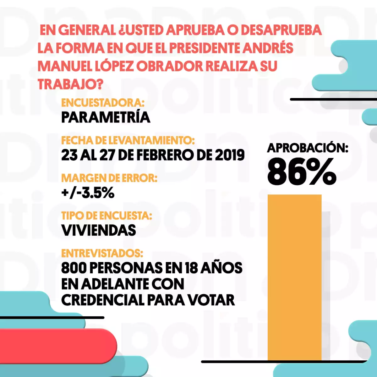 En este caso, la casa encuestadora cuestionó: en general ¿usted aprueba o desaprueba la forma en que el presidente Andrés Manuel López Obrador realiza su trabajo? El 86% de los entrevistados respondió que lo aprueba, de los cuales el 66% expuso que mucho y el 20% poco, mientras que el porcentaje de desaprobación es de 8% en los primeros tres meses de gobierno.