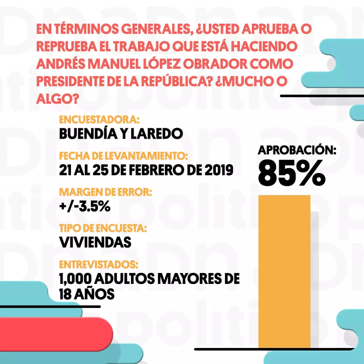 La pregunta de la encuestadora fue ¿usted aprueba el trabajo que está haciendo Andrés Manuel López Obrador como presidente de la República? ¿Mucho o algo? El 85% de los encuestados contestó que lo aprueba mucho o algo.