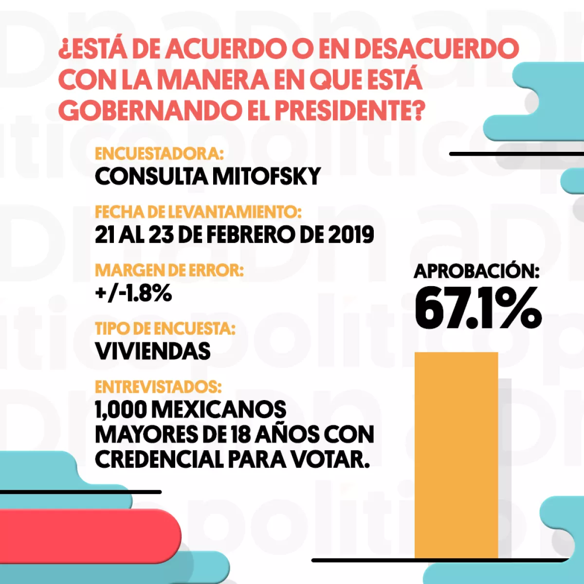 La medición de Consulta Mitofsky reveló la aprobación más baja del presidente entre las cuatro casas encuestadoras consideradas. De acuerdo con este ejercicio, el 67.1% de los entrevistados están de acuerdo con la manera en la que está gobernando López Obrador.