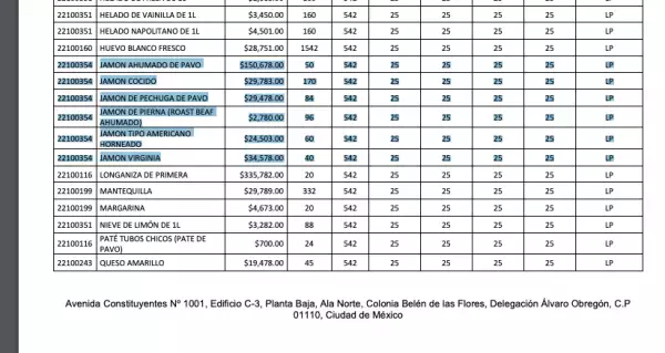 Así, entre otras compras de alimentos planteados en ese documento destaca también el presupuesto de 271,800 pesos por diversos tipos de jamón; en este apartado se especifica, por ejemplo, un monto de 150,678 pesos por 50 unidades de jamón ahumado; es decir, cada pieza tendría costo de 3,013 pesos. Un precio que es mayor al del mercado, pues al buscar jamón ahumado por pieza en las páginas de supermercados por internet, cada unidad completa, ronda los 1,500 pesos por paquetes que contienen entre 4 y 6 kilos de jamón, dependiendo de la marca. El desglose de presidencia no indica la marca, sólo una variedad de seis tipos de jamones: ahumado, cocido, pechuga de pavo, rosast beaf ahumado, tipo americano horneado, y virginia.