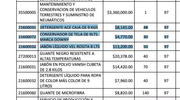 Otro ejemplo destacado es el de productos de limpieza para telas. El listado de la Oficina de la Presidencia incluye cinco apartados para los que asigna 48,499 pesos. El desglose incluye detergente "Ace", conservador de tela "Downy", "Vel Rosita", jabón "Vanish" y detergente "Más Color".