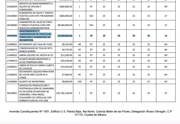 Otro rubro que pone en tela de juicio los dichos del presidente es el concerniente al mantenimiento de autos, en el listado aparece un apartado para “Mantenimiento y conservación de vehículos terrestres y suministro de neumáticos” por 3,360,000 pesos.