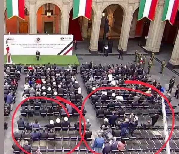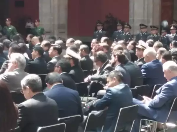 Al otro lado de la esposa del presidente se sentó al ministro presidente de la Suprema Corte, Arturo Zaldívar, y a la escritora Elena Poniatowska, Después de ella Porfirio Muñoz Ledo, el ratificado presidente de la mesa directiva de la Cámara de Diputados. Luego, el gabinete completo.