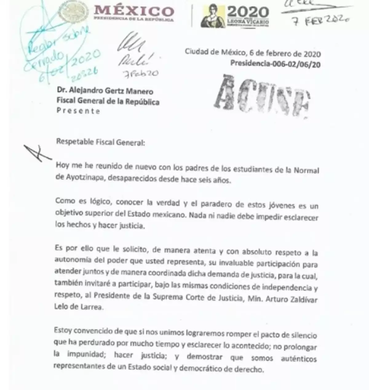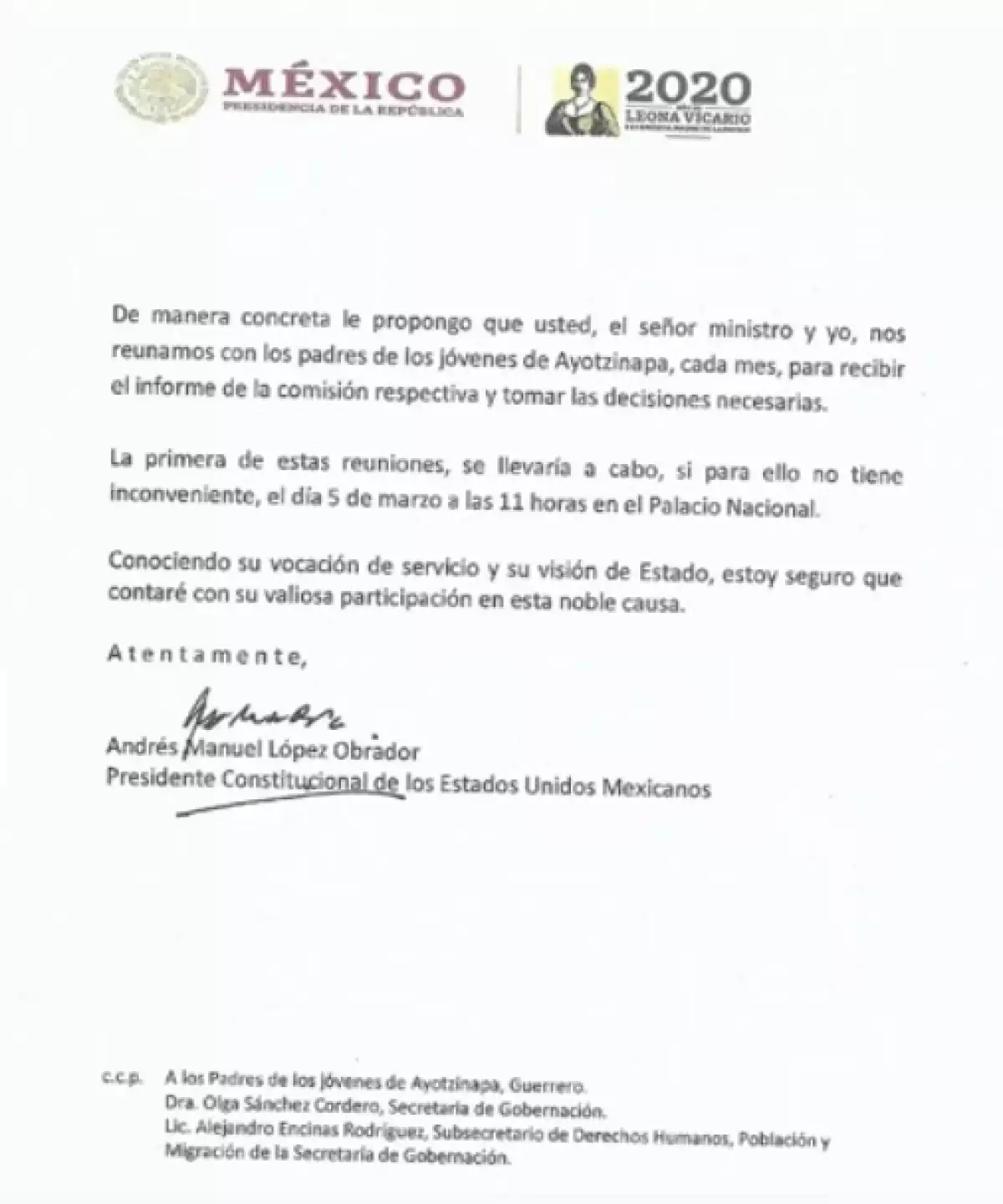 El pasado jueves, el presidente de la República sostuvo la segunda reunión del año con los padres de los 43 normalistas, encuentro en el que se definió que la siguiente reunión sería el 5 de marzo. De acuerdo con López Obrador, tras ese encuentro le envió una carta al fiscal Gertz Manero y al presidente de la Corte, Zaldívar Lelo de Larrea, de quienes ya tuvo respuesta.