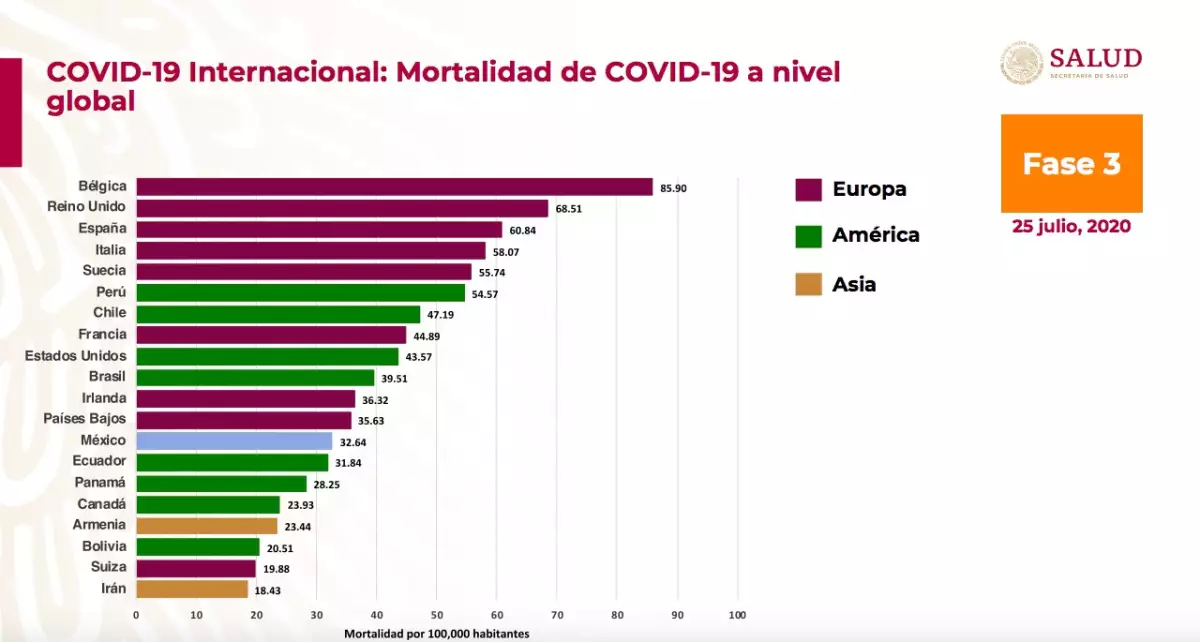 Ridaura también dio a conocer cuáles son las naciones con mayores tasas de mortalidad ya que explicó que es de acuerdo con el tamaño de la población que se deben medir la cantidad de muertes que ocurren en un país.