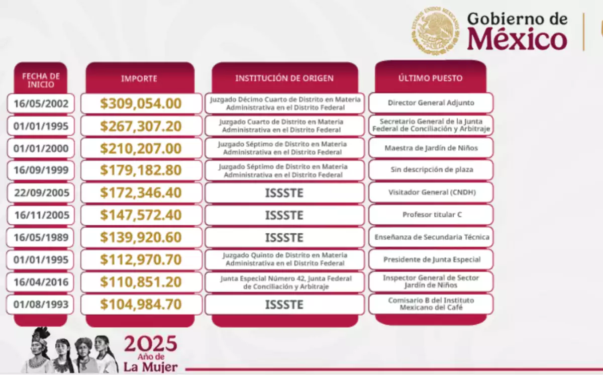 Batres apuntó así que, de las 10 pensiones más altas identificadas, siete son superiores al ingreso de la presidenta de México. En tanto que cuatro de ellas fueron otorgadas por el ISSSTE directamente y seis de ellas por el Poder Judicial.