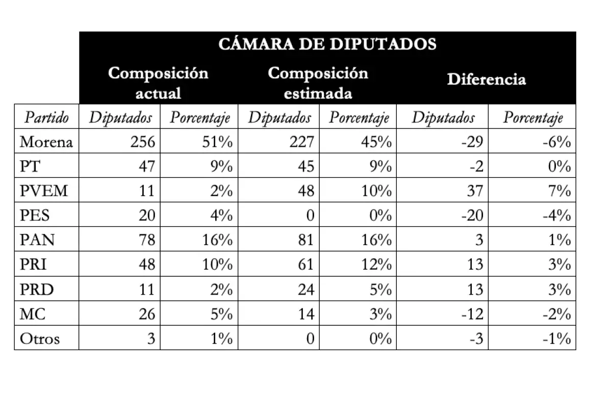 Actualmente, Morena tiene 256 diputados, es decir, el 51% de la Cámara. Mayoría absoluta. Y la coalición lopezobradorista (Morena más el PT, el viejo PES y el PVEM) suma 334 curules, o sea, el 67%. Mayoría calificada. Sin embargo, ambas cifras podrían descender tras la jornada del 6 de junio. Según Oraculus, Morena obtendría alrededor de 227 curules, el equivalente al 45%; y la coalición lopezobradorista (Morena más el PT y el PVEM, porque el nuevo PES no parece que vaya a ganar ninguna), cuestión de 320, es decir, el 64%. No se trata de una derrota estrepitosa. Es una pérdida de apenas 6 puntos porcentuales del total de la Cámara para Morena y de 3 para la coalición, pero con el potencial de provocar un profundo cambio en la correlación de fuerzas legislativas.