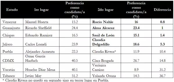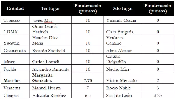 Segundo, porque se supone que la primaria a través de encuestas sirve para elegir a las figuras más competitivas, es decir, con mayor intención de voto potencial entre el electorado. En este caso, las encuestas de Morena midieron ocho aspectos, cada uno ponderado con puntajes distintos que, en total, sumaban hasta 10 puntos: “opinión positiva” (2), “honestidad” (1.25), “cercanía” (.25), “conoce el estado” (.25), “cumple” (.25), “buen candidato” (1), “disposición a votar” (2) y “preferencia como candidato/a de Morena” (3). Los aspirantes que obtuvieran el porcentaje más alto en cada uno de esos aspectos sumaban el puntaje correspondiente. Los resultados de esa ponderación fueron los siguientes:
