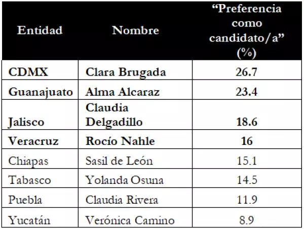 Tercero, porque las autoridades electorales establecieron que, conforme al principio de paridad de género, los partidos tendrán que nominar mujeres en cinco de las nueve entidades en disputa. Pero en la encuesta de Morena solo ganó una. A juzgar por la distribución final de candidaturas la dirigencia nacional de ese partido optó, entonces, por favorecer a las mujeres que obtuvieron los porcentajes más altos en el aspecto con mayor ponderación (3 puntos): “preferencia como candidato/a de Morena”.