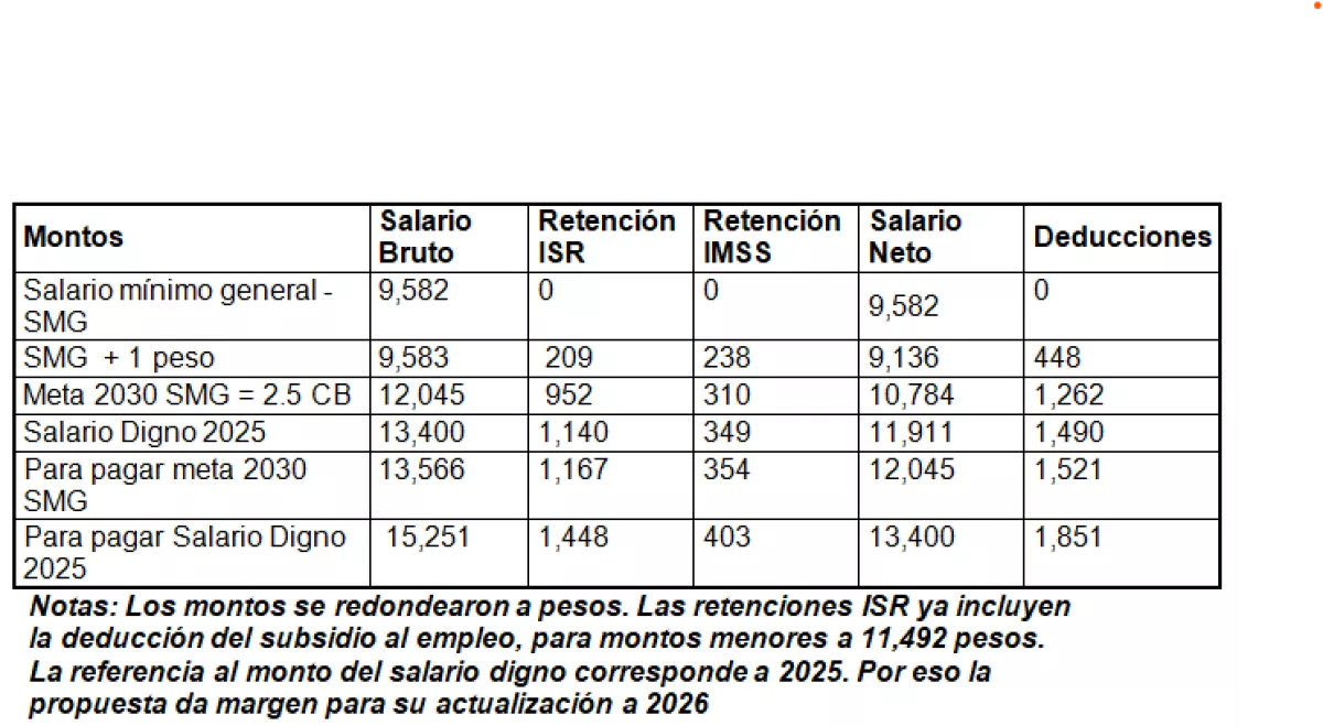 La Ley Federal del Trabajo y la Ley del IMSS establecen que el salario mínimo no debe estar sujeto a retenciones. Quien gana esa cantidad debe recibirla íntegra. Sin embargo, las tablas vigentes del ISR y del IMSS no se han ajustado al alza del salario mínimo. El resultado es que una persona que gane apenas un peso más ya es sujeto de retenciones.